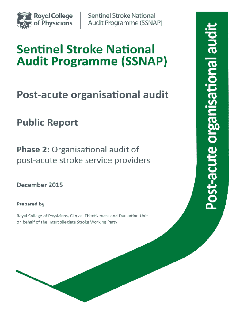 SSNAP Postacute Organisational Audit Phase 2: Audit of postacute stroke service providersDocument purposeTo disseminate the service level results of the Postacute Provider Organisational Audit, Phase 2 of the Sentinel Stroke National Audit Programme (SSNAP) Postacute Organisational Audit. Results are for services located in England, Wales and Northern Ireland.TitleSSNAP Postacute Organisational Audit 2015: Phase 2 Organisational audit of postacute stroke services providersAuthorOn