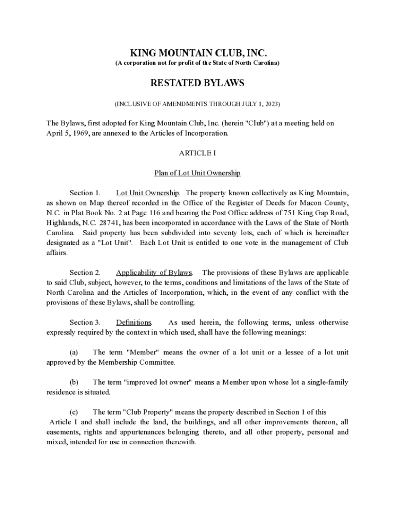 KING MOUNTAIN CLUB, INC. (A corporation not for profit of the State of North Carolina)RESTATED BYLAWS (INCLUSIVE OF AMENDMENTS THROUGH JULY 1, 2023)The Bylaws, first adopted for King Mountain Club,