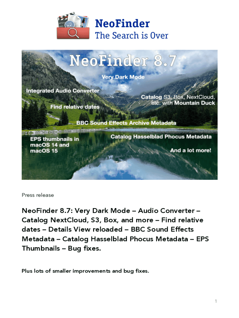 The Search is OverPress releaseNeoFinder 8.7: Very Dark Mode Audio Converter Catalog NextCloud, S3, Box, and more Find relative dates Details View reloaded BBC Sound Effects Metadata Catalog Hasselblad Phocus Metadata EPS Thumbnails Bug xes. Plus lots of smaller improvements and bug xes.fi1fiNeoFinderVery Dark Mode NeoFinder now fully supports macOS Dark Mode in all windows and every single interface element.The previous versions of NeoFinder
