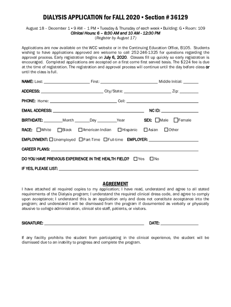 DIALYSIS APPLICATION FALL 2020 Admission into the Dialysis Technician program is by application, and only completed applications will be accepted. The schedule for FALL 2020 semester is available
