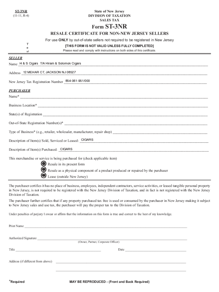 ST3NRState of New Jersey DIVISION OF TAXATION SALES TAX(1111, R4)Form ST3NRRESALE CERTIFICATE FOR NONNEW JERSEY SELLERS For use ONLY by outofstate sellers not required to be registered in New Jersey