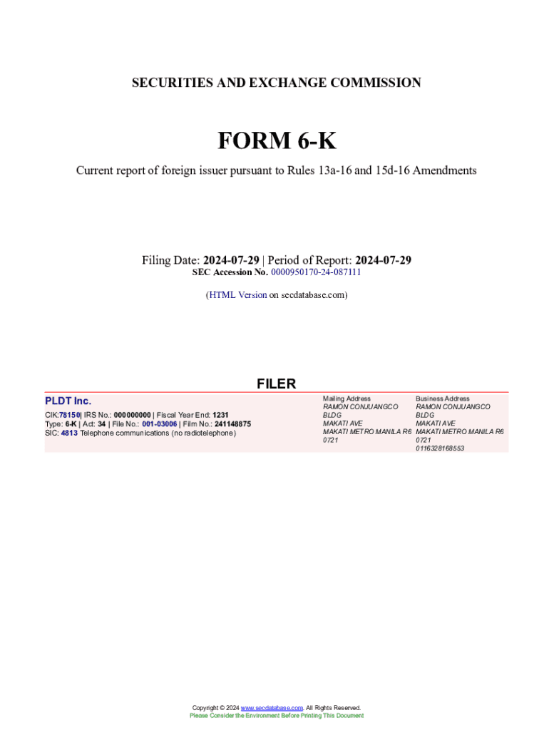 Get the free PLDT Inc. Form 6-K Current Event Report Filed 2024-07-29. Accession Number