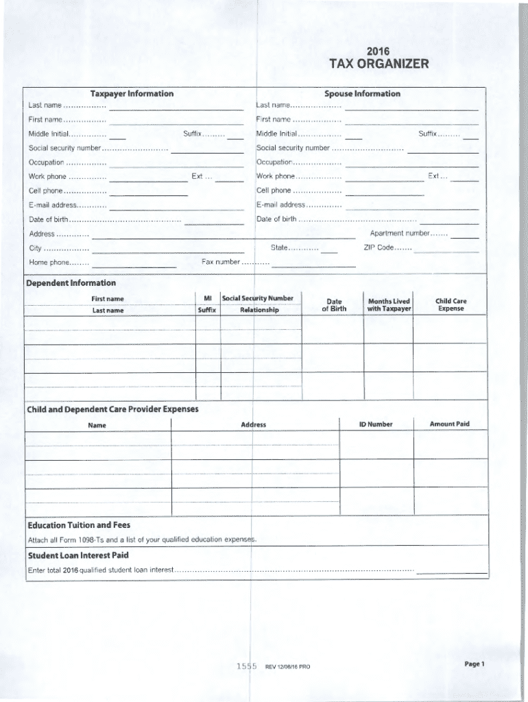 2016TAX ORGANIZER Taxpayer InformationSpouse InformationLast nameLast nameFirst nameFirst name SuffixMiddle InitialMiddle InitialSuffixSocial security numberSocial security numberOccupationOccupation