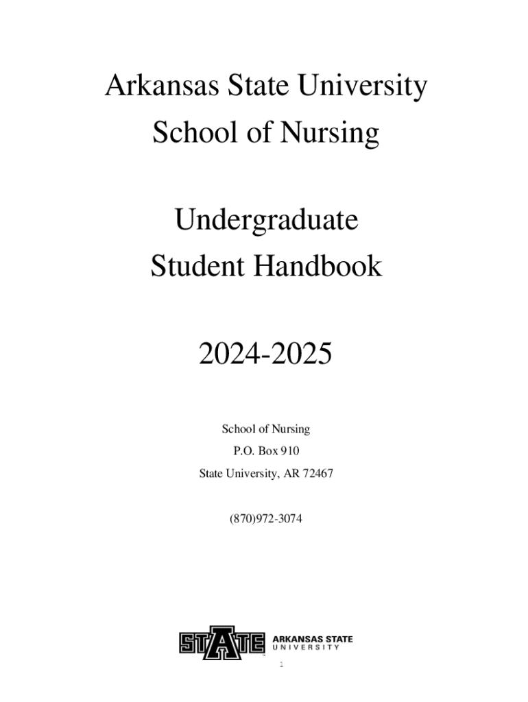 Arkansas State University School of Nursing Undergraduate Student Handbook 20242025 School of Nursing P.O. Box 910 State University, AR 72467(870)97230741The student handbook for nursing majors was developed by a studentfaculty committee from nursing, incorporating suggestions received from AState students, faculty and administrators. It is designed to inform nursing majors regarding nursing policy, and to assist the students in their educational planning.It is the students responsibility to...