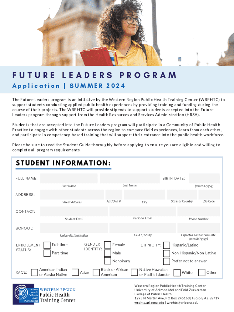 FUTURE LEADERS PROGRAM Application | SUMMER 2024 The Future Leaders program is an initiative by the Western Region Public Health Training Center (WRPHTC) to support students conducting applied public health experiences by providing training and funding during the course of their projects. The WRPHTC will provide stipends to support students accepted into the Future Leaders program through support from the Health Resources and Services Administration (HRSA). Students that are accepted into the...