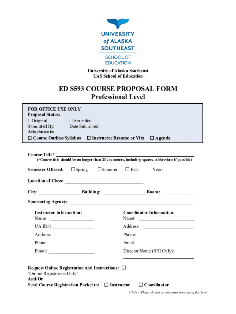 UNIVERSITY of ALASKA SOUTHEAST SCHOOL OF EDUCATIONUniversity of Alaska Southeast UAS School of EducationED S593 COURSE PROPOSAL FORM Professional Level FOR OFFICE USE ONLY Proposal Status: Original