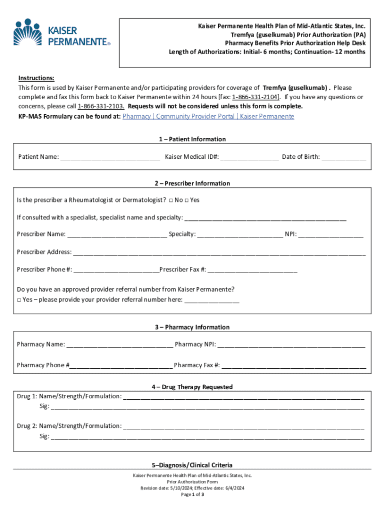 Kaiser Permanente Health Plan of MidAtlantic States, Inc. Tremfya (guselkumab) Prior Authorization (PA) Pharmacy Benefits Prior Authorization Help Desk Length of Authorizations: Initial 6 months;