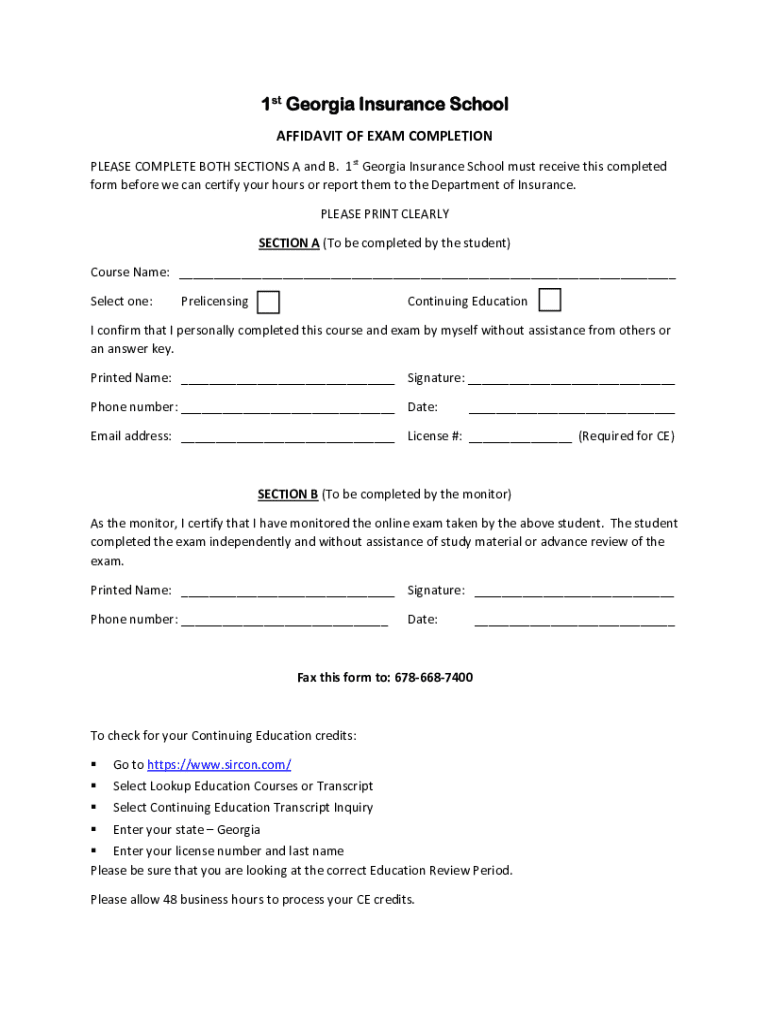 1st Georgia Insurance School AFFIDAVIT OF EXAM COMPLETION PLEASE COMPLETE BOTH SECTIONS A and B. 1st Georgia Insurance School must receive this completed form before we can certify your hours or report them to the Department of Insurance. PLEASE PRINT CLEARLY SECTION A (To be completed by the student) Course Name: ___ Select one:PrelicensingContinuing EducationI confirm that I personally completed this course and exam by myself without assistance from others or an answer key. Printed Name: