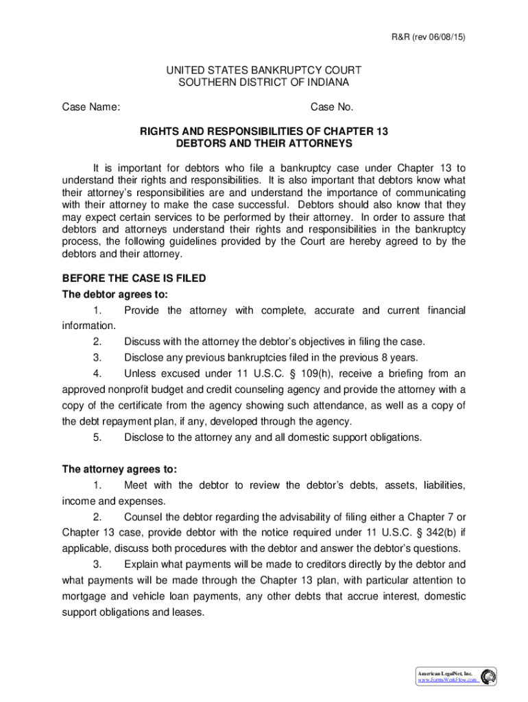 R&R (rev 06/08/15)UNITED STATES BANKRUPTCY COURT SOUTHERN DISTRICT OF INDIANA Case Name:Case No. RIGHTS AND RESPONSIBILITIES OF CHAPTER 13 DEBTORS AND THEIR ATTORNEYSIt is important for debtors who