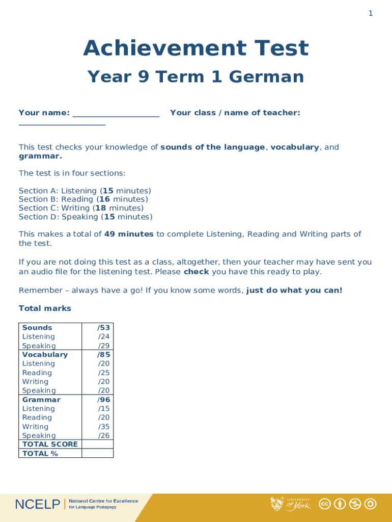 Template Year 9 German Term 1.2 assessment - achievement test instructions