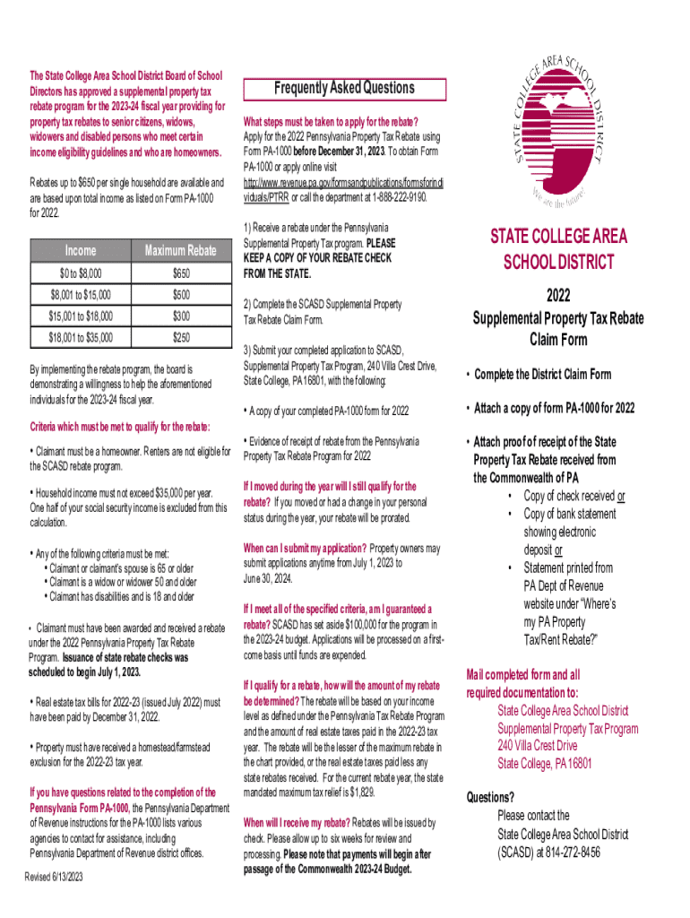 The State College Area School District Board of School Directors has approved a supplemental property tax rebate program for the 202324 fiscal year providing for property tax rebates to senior citizens,