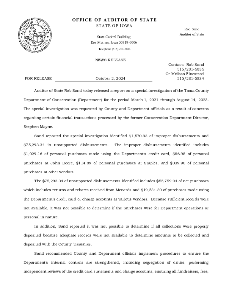 OFFICE OF AUDITOR OF STATE STATE O F I OWAState Capitol Building Des Moines, Iowa 503190006Rob Sand Auditor of StateTelephone (515) 2815834NEWS RELEASEFOR RELEASEOctober 2, 2024Contact: Rob Sand 515/2815835 Or Melissa Finestead 515/2815834Auditor of State Rob Sand today released a report on a special investigation of the Tama County Department of Conservation (Department) for the period March 1, 2021 through August 14, 2023. The special investigation was requested by County and