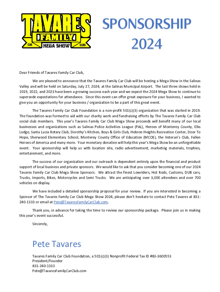 SPONSORSHIP 2024 Dear Friends of Tavares Family Car Club, We are pleased to announce that the Tavares Family Car Club will be hosting a Mega Show in the Salinas Valley and will be held on Saturday,