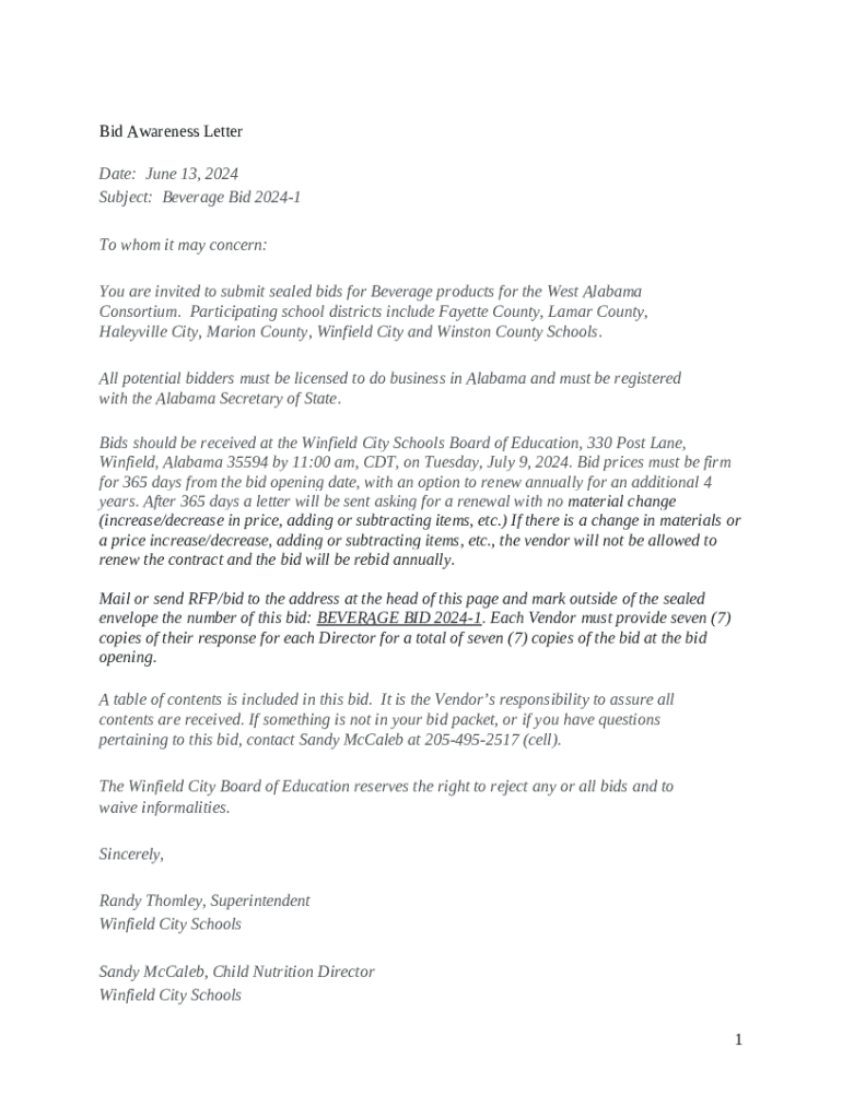 Template You are invited to submit sealed bids for Beverage products for the West Alabama Consortium instructions