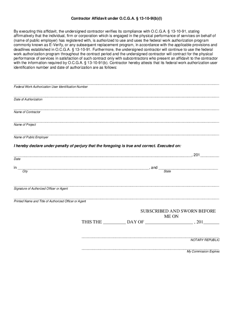 Contractor Affidavit under O.C.G.A. 13109l(b)(l) By executing this affidavit, the undersigned contractor verifies its compliance with O.C.G.A. 131091, stating affirmatively that the individual, firm