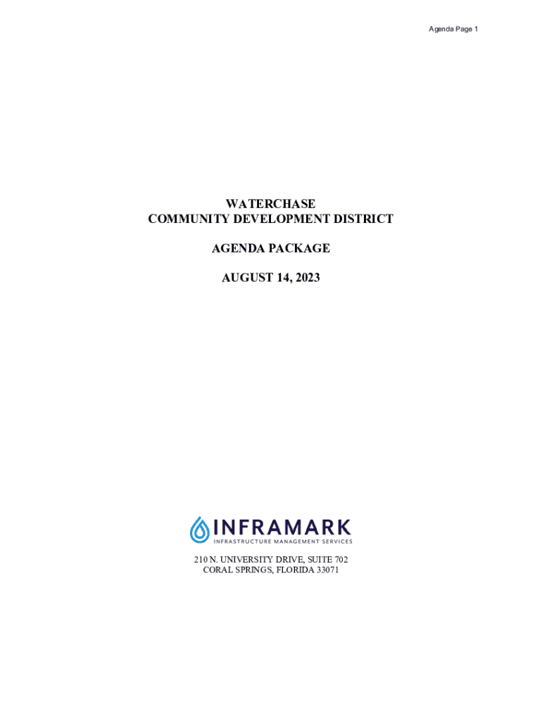 Agenda Page 1WATERCHASE COMMUNITY DEVELOPMENT DISTRICT AGENDA PACKAGE AUGUST 14, 2023210 N. UNIVERSITY DRIVE, SUITE 702 CORAL SPRINGS, FLORIDA 33071Waterchase Community Development District Board of SupervisorsAgenda Page 2David Wenck, District Manager Vivek Babbar, District Counsel Tonja Stewart, District EngineerIan Watson, Chairman Salvatore Mancini, Vice Chairman Michael Acheson, Assistant Secretary G. Arnie Daniels, Assistant Secretary Christopher Rizzo, Assistant SecretaryRegular