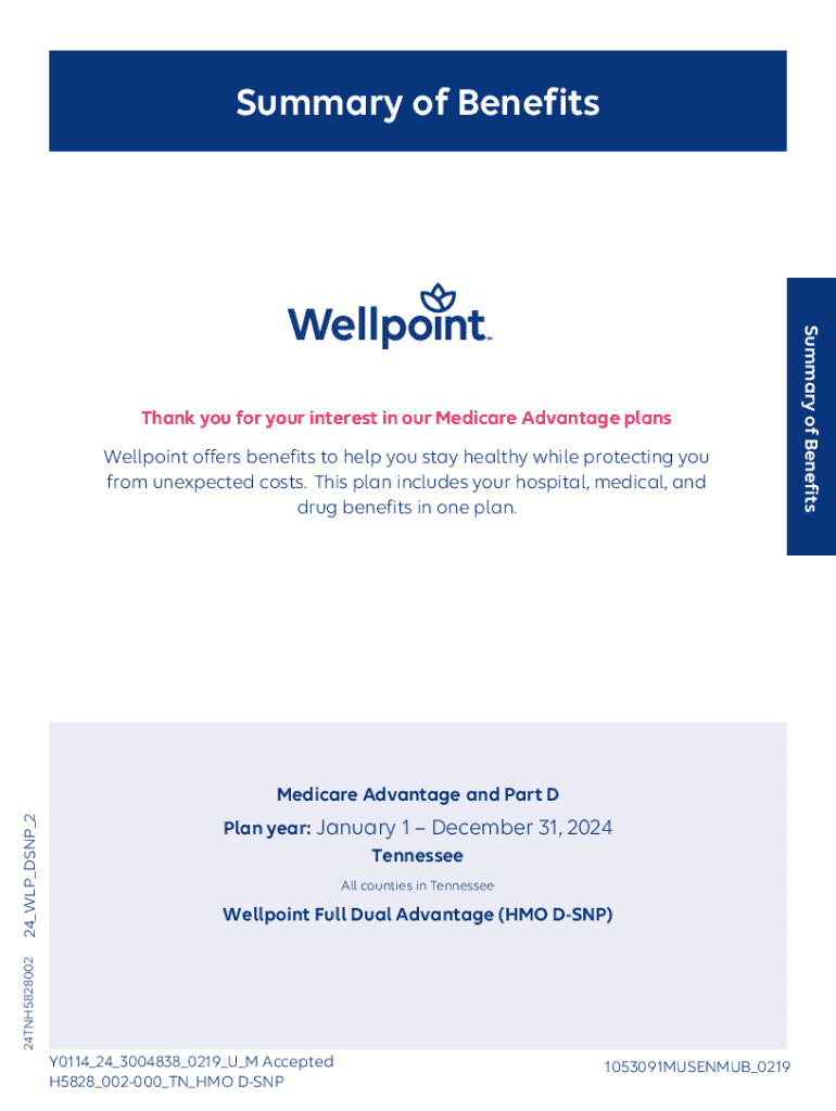 Summary of BenefitsWellpoint offers benefits to help you stay healthy while protecting you from unexpected costs. This plan includes your hospital, medical, and drug benefits in one plan.Plan year: January 1 December 31, 2024 Tennessee All counties in TennesseeWellpoint Full Dual Advantage (HMO DSNP)24TNH582800224_WLP_DSNP_2Medicare Advantage and Part DY0114_24_3004838_0219_U_M Accepted H5828_002000_TN_HMO DSNP1053091MUSENMUB_0219Summary of BenefitsThank you for your interest