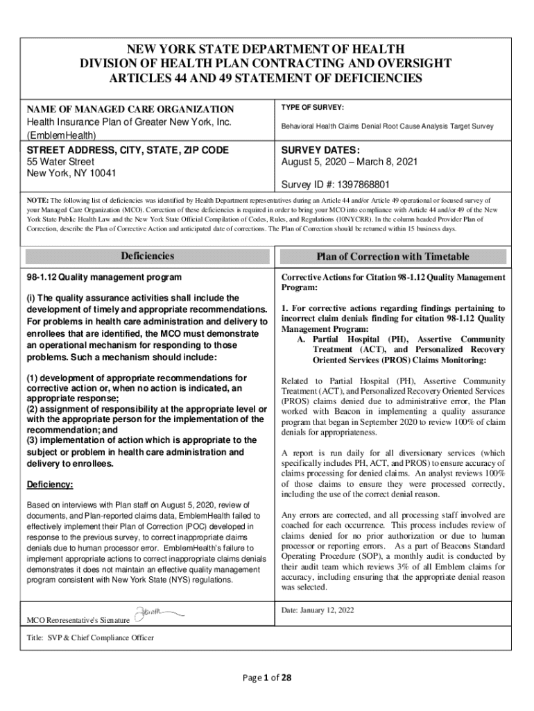 NEW YORK STATE DEPARTMENT OF HEALTH DIVISION OF HEALTH PLAN CONTRACTING AND OVERSIGHT ARTICLES 44 AND 49 STATEMENT OF DEFICIENCIES TYPE OF SURVEY:NAME OF MANAGED CARE ORGANIZATION Health Insurance Plan of Greater New York, Inc. (EmblemHealth) tytyt STREET ADDRESS, CITY, STATE, ZIP CODE 55 Water Street New York, NY 10041Behavioral Health Claims Denial Root Cause Analysis Target SurveySURVEY DATES: August 5, 2020 March 8, 2021 Survey ID #: 1397868801NOTE: The following list of deficiencies