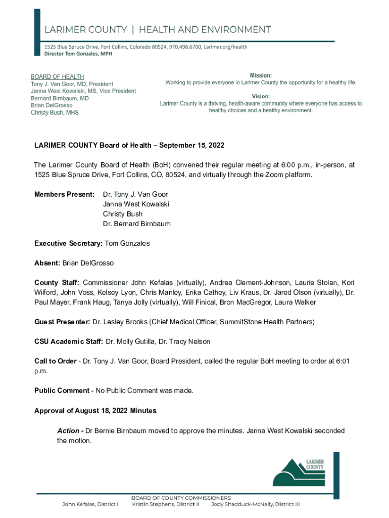 LARIMER COUNTY Board of Health September 15, 2022 The Larimer County Board of Health (BoH) convened their regular meeting at 6:00 p.m., inperson, at 1525 Blue Spruce Drive, Fort Collins, CO, 80524,