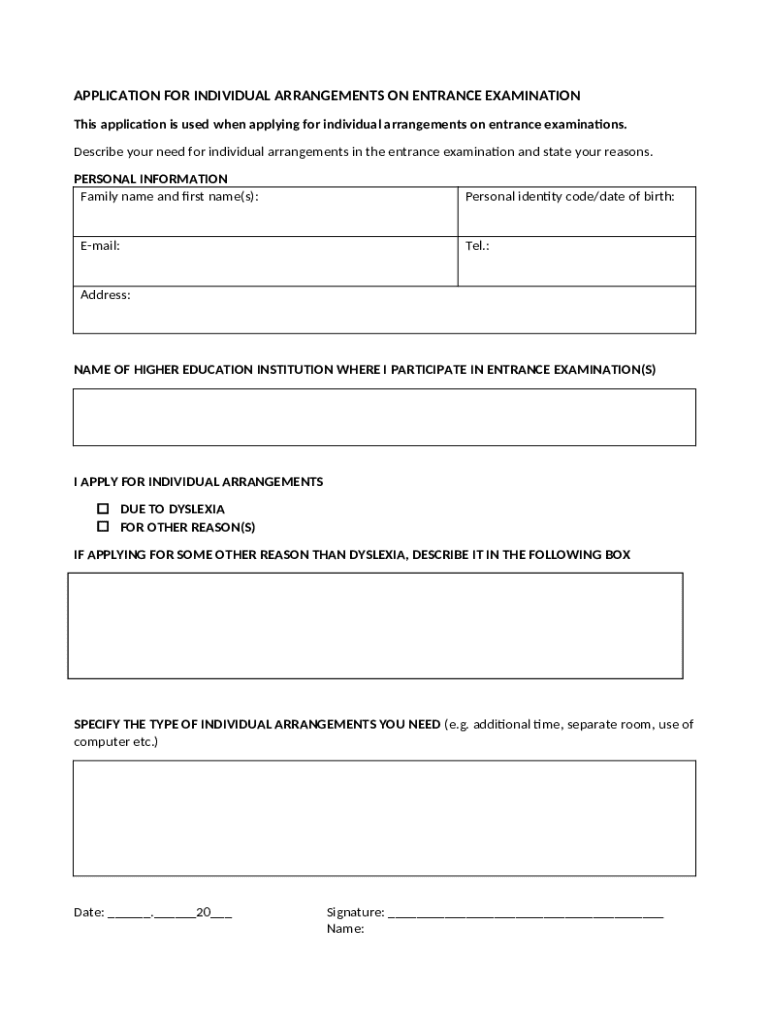 The Application for special arrangements on entrance ... is a Word document that should be submitted to the specific address in order to provide specific information. It needs to be completed and signed, which is possible manually, or with a certain software such as PDFfiller. This tool lets you complete any PDF or Word document directly in your browser, customize it according to your requirements and put a legally-binding e-signature. Right after completion, the user can easily send the Application for special arrangements on entrance ... to the relevant individual, or multiple recipients via email or fax. The template is printable as well because of PDFfiller feature and options offered for printing out adjustment. Both in electronic and physical appearance, your form will have got organized and professional appearance. Also you can turn it into a template for later, without creating a new file from scratch. Just edit the ready template.