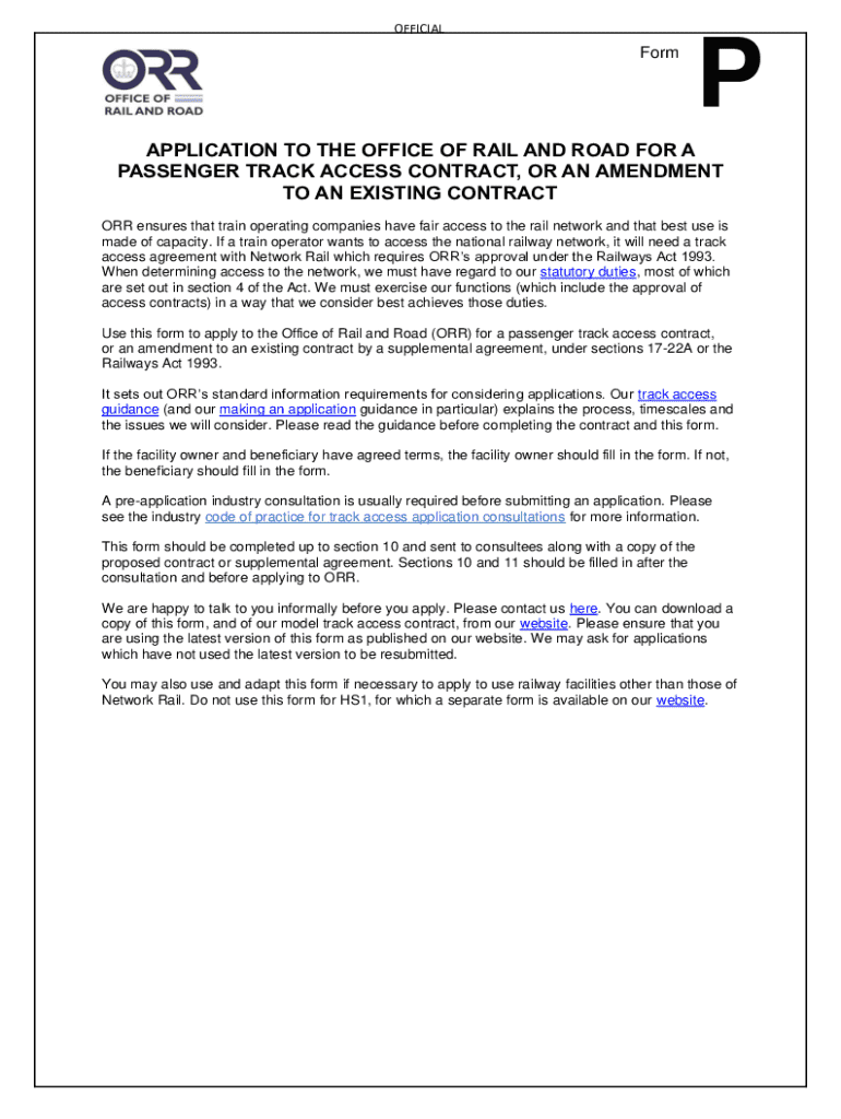 OFFICIALFormPAPPLICATION TO THE OFFICE OF RAIL AND ROAD FOR A PASSENGER TRACK ACCESS CONTRACT, OR AN AMENDMENT TO AN EXISTING CONTRACT ORR ensures that train operating companies have fair access to the rail network and that best use is made of capacity. If a train operator wants to access the national railway network, it will need a track access agreement with Network Rail which requires ORRs approval under the Railways Act 1993. When determining access to the network, we must have regard