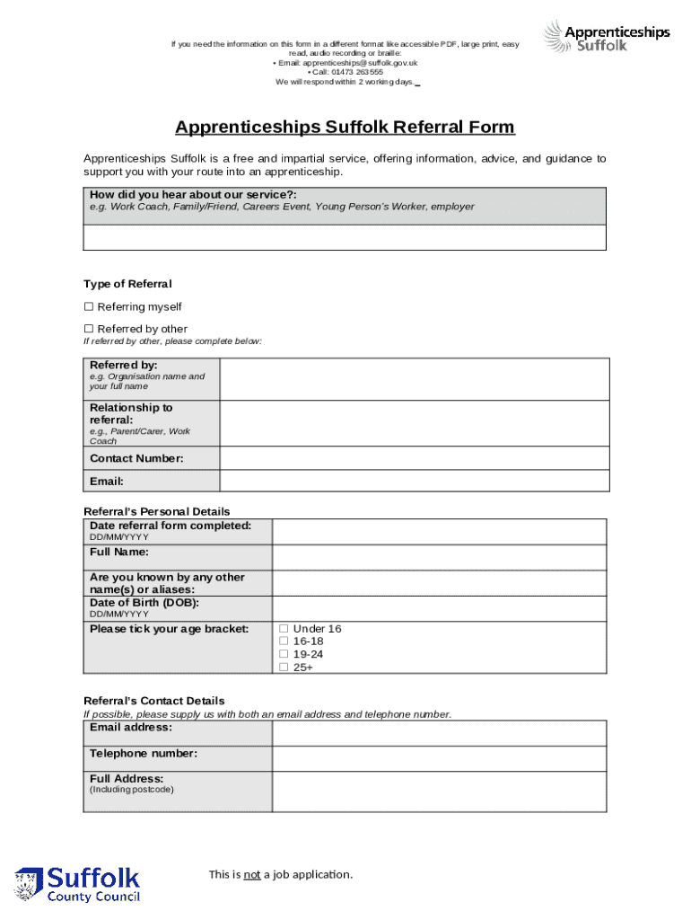 When you're ready to begin filling out the Apprenticeships Suffolk Referral writable template, it's important to make certain that all the required details are prepared. This very part is highly significant, due to errors may cause unpleasant consequences. It is really distressing and time-consuming to re-submit an entire word template, not even mentioning penalties caused by blown deadlines. Handling the digits requires more attention. At a glimpse, there is nothing tricky with this task. Nevertheless, it doesn't take much to make an error. Experts recommend to store all required information and get it separately in a file. Once you have a writable template, you can just export this information from the file. In any case, it's up to you how far can you go to provide true and solid data. Doublecheck the information in your Apprenticeships Suffolk Referral form when filling all necessary fields. In case of any error, it can be promptly fixed within PDFfiller editor, so that all deadlines are met.
