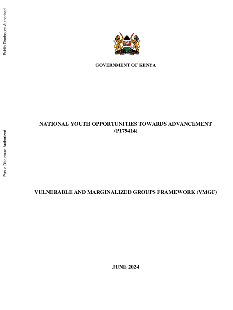 Public Disclosure Authorized Public Disclosure AuthorizedPublic Disclosure AuthorizedGOVERNMENT OF KENYANATIONAL YOUTH OPPORTUNITIES TOWARDS ADVANCEMENT (P179414)Public Disclosure AuthorizedVULNERABLE AND MARGINALIZED GROUPS FRAMEWORK (VMGF)JUNE 2024Table of Contents EXECUTIVE SUMMARY ..................................................................................................................................... iii 1.INTRODUCTION ............................................