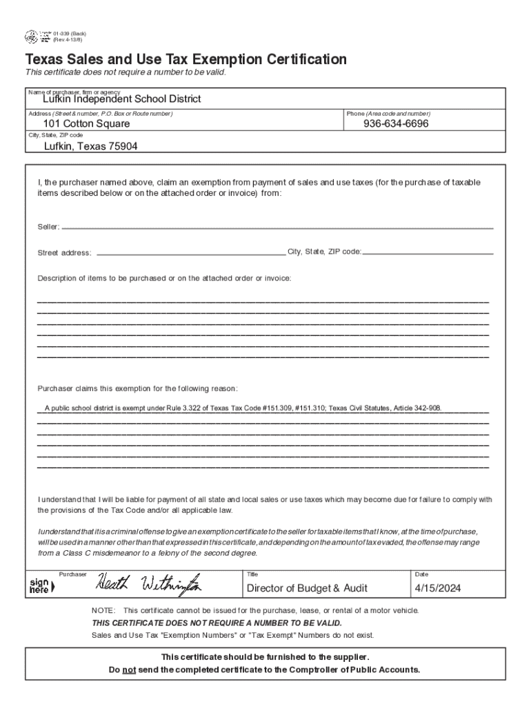 Get the free Tax Exemption Certificate 24. 01-339 Sales and Use Tax Resale Certificate / Exemptio...