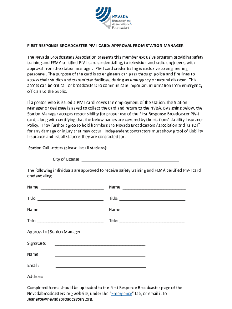 FIRST RESPONSE BROADCASTER PIVI CARD: APPROVAL FROM STATION MANAGER The Nevada Broadcasters Association presents this member exclusive program providing safety training and FEMA certified PIVI card credentialing, to television and radio engineers, with approval from the station manager. PIVI card credentialing is exclusive to engineering personnel. The purpose of the card is so engineers can pass through police and fire lines to access their studios and transmitter facilities, during an...