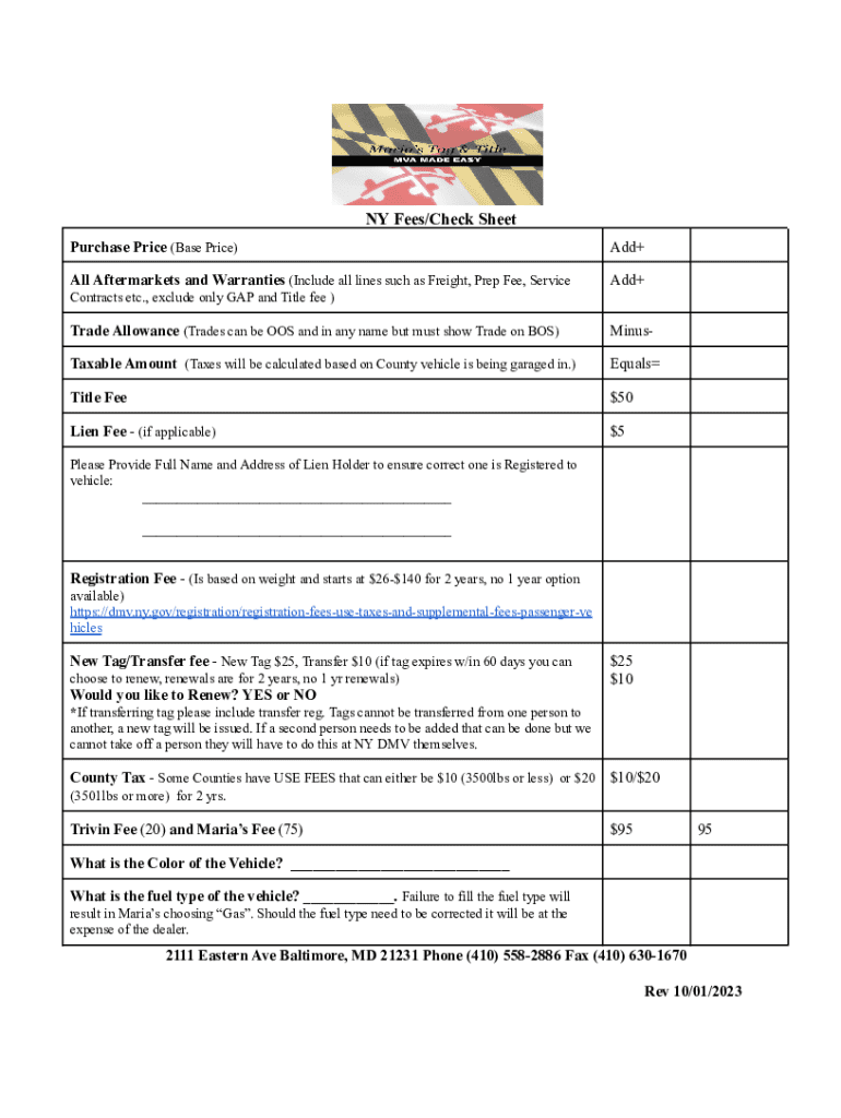 Get the free NY Fees/Check Sheet