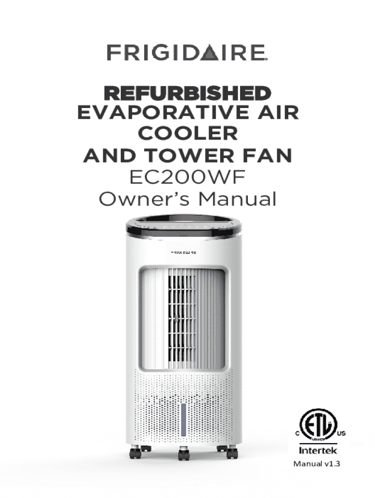 REFURBISHED EVAPORATIVE AIR COOLER AND TOWER FAN EC200WF Owners ManualManual v1.32READ AND SAVE THESE INSTRUCTIONS. TABLE OF CONTENTS Register Your Product Online ....................................................................... 3 Safety Information & Warnings ................................................................... 4 Parts List ................................................................................................................5 Features ...................