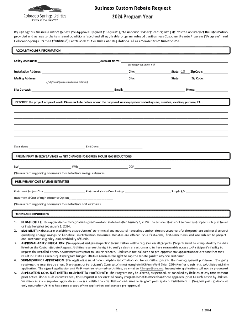 Business Custom Rebate Request 2024 Program Year By signing this Business Custom Rebate PreApproval Request (Request), the Account Holder (Participant) affirms the accuracy of the information provided