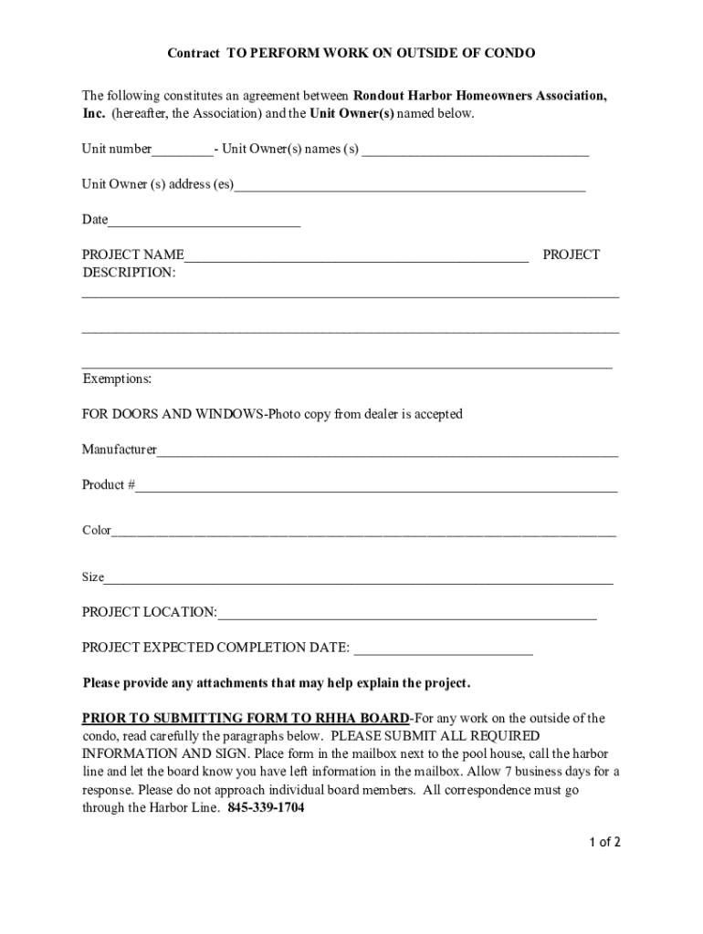 Contract TO PERFORM WORK ON OUTSIDE OF CONDO The following constitutes an agreement between Rondout Harbor Homeowners Association, Inc. (hereafter, the Association) and the Unit Owner(s) named below.