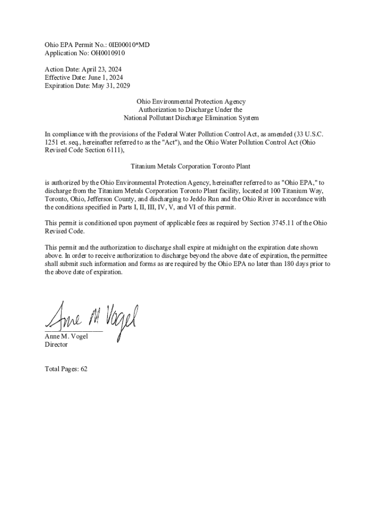 Ohio EPA Permit No.: 0IE00010*MD Application No: OH0010910 Action Date: April 23, 2024 Effective Date: June 1, 2024 Expiration Date: May 31, 2029 Ohio Environmental Protection Agency Authorization