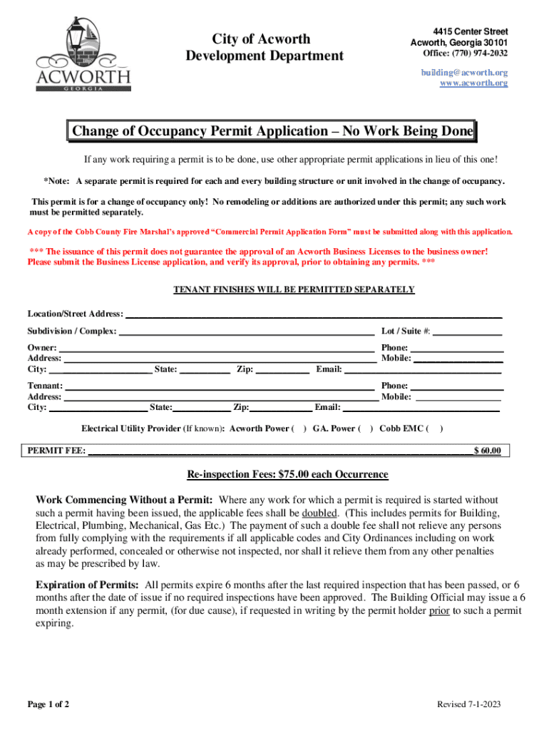 4415 Center Street Acworth, Georgia 30101 Office: (770) 9742032City of Acworth Development Departmentbuilding@acworth.org www.acworth.orgChange of Occupancy Permit Application No Work Being Done If any work requiring a permit is to be done, use other appropriate permit applications in lieu of this one! *Note: A separate permit is required for each and every building structure or unit involved in the change of occupancy. This permit is for a change of occupancy only! No remodeling or additions