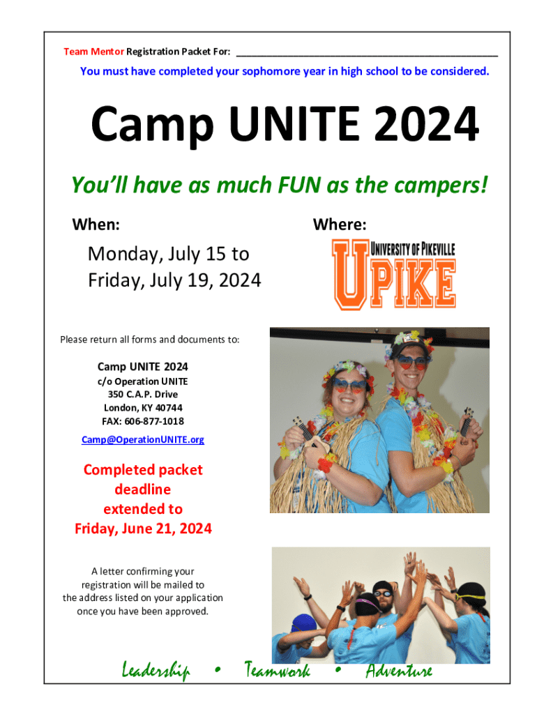 Team Mentor Registration Packet For: ___You must have completed your sophomore year in high school to be considered.Camp UNITE 2024 Youll have as much FUN as the campers! When:Where:Monday, July 15