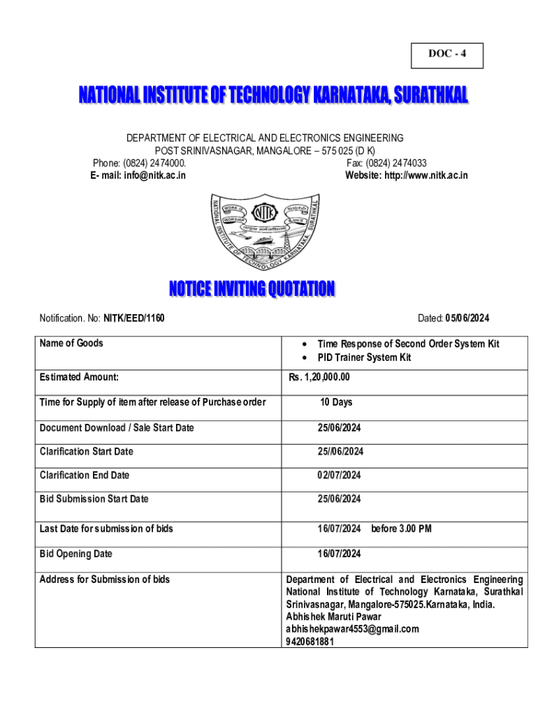 DOC 4DEPARTMENT OF ELECTRICAL AND ELECTRONICS ENGINEERING POST SRINIVASNAGAR, MANGALORE 575 025 (D K) Phone: (0824) 2474000. Fax: (0824) 2474033 E mail: info@nitk.ac.in Website: http://www.nitk.ac.inNotification. No: NITK/EED/1160 Name of Goods Estimated Amount:Dated: 05/06/2024 Time Response of Second Order System Kit PID Trainer System KitRs. 1,20,000.00Time for Supply of item after release of Purchase order10 DaysDocument Download / Sale Start Date25/06/2024Clarification