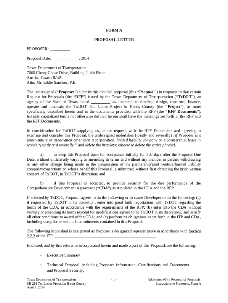 The SH 288 - RFP Addendum 3 ITP s. SH 288 is a document needed to be submitted to the specific address to provide specific info. It needs to be completed and signed, which can be done manually, or by using a particular solution such as PDFfiller. It allows to fill out any PDF or Word document directly in your browser, customize it according to your purposes and put a legally-binding e-signature. Once after completion, the user can easily send the SH 288 - RFP Addendum 3 ITP s. SH 288 to the relevant receiver, or multiple ones via email or fax. The blank is printable too due to PDFfiller feature and options proposed for printing out adjustment. Both in digital and physical appearance, your form will have got organized and professional appearance. It's also possible to turn it into a template to use it later, so you don't need to create a new file from the beginning. You need just to edit the ready template.