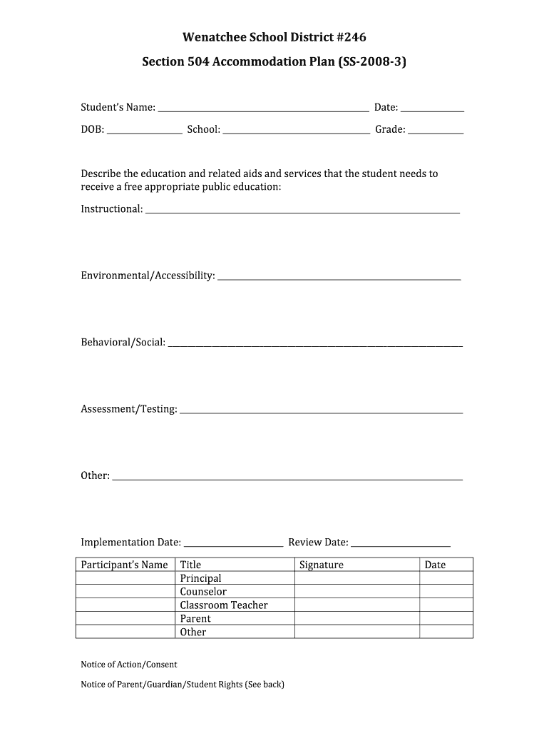 Get the free Wenatchee School District #246 Section 504 Accommodation Plan ... - wenatcheeschools