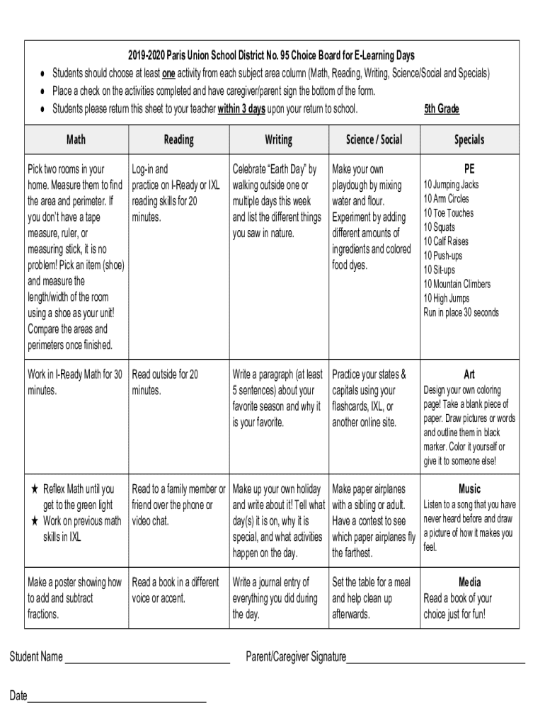 20192020 Paris Union School District No. 95 Choice Board for ELearning Days Students should choose at least one activity from each subject area column (Math, Reading, Writing, Science/Social and Specials) Place a check on the activities completed and have caregiver/parent sign the bottom of the form. Students please return this sheet to your teacher within 3 days upon your return to school. 5th Grade MathReadingWritingScience / SocialPick two rooms in your home