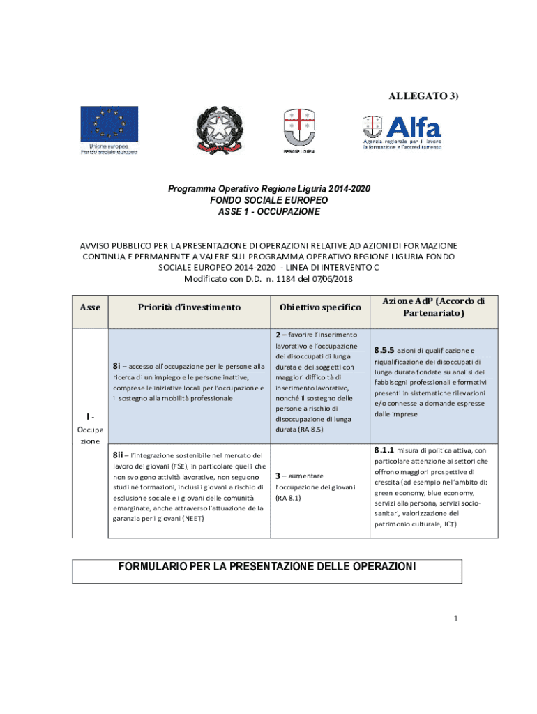 ASSE 1 OCCUPAZIONEAVVISO PUBLIC PER LA PRESENTATION DI OPERATION RELATIVE AD ZION DI FORMATION
