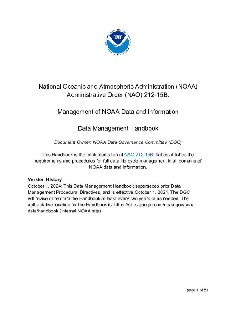 National Oceanic and Atmospheric Administration (NOAA) Administrative Order (NAO) 21215B: Management of NOAA Data and Information Data Management Handbook Document Owner: NOAA Data Governance Committee (DGC) This Handbook is the implementation of NAO 21215B that establishes the requirements and procedures for full data life cycle management in all domains of NOAA data and information. Version History October 1, 2024: This Data Management Handbook supersedes prior Data Management Procedural...
