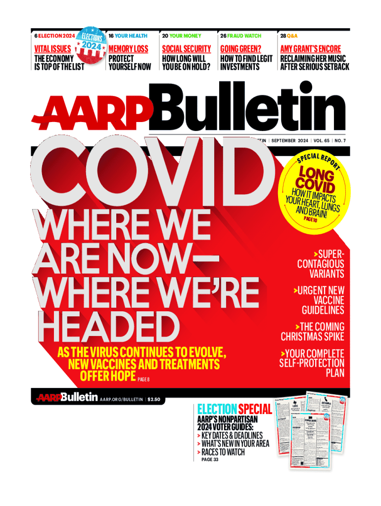6 ELECTION 202416 YOUR HEALTH20 YOUR MONEY26 FRAUD WATCH28 Q&AVITAL ISSUES THE ECONOMY IS TOP OF THE LISTMEMORY LOSS PROTECT YOURSELF NOWSOCIAL SECURITY HOW LONG WILL YOU BE ON HOLD?GOING GREEN? AMY GRANTS ENCORE HOW TO FIND LEGIT RECLAIMING HER MUSIC INVESTMENTS AFTER SERIOUS SETBACKBulletin AARP.ORG/BULLETIN | SEPTEMBER 2024 | VOL. 65 | NO. 7SPECIAL REPORTLONG COVID HOW IT IM PYOUR HEA ACTS R LUNGS AND BRTA,IN ! PAGE 10SUPERCONTAGIOUS VARIANTS URGENT NEW VACCINE GUIDELINES THE