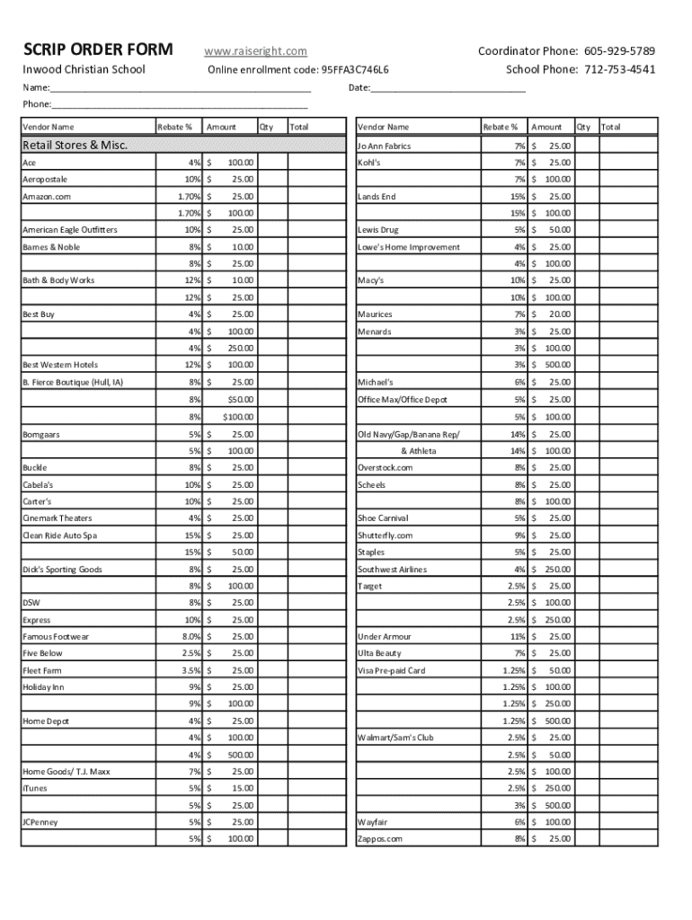 SCRIP ORDER Form.raise right.cottonwood Christian SchoolOnline enrollment code: 95FFA3C746L6Name:___Coordinator Phone: 6059295789