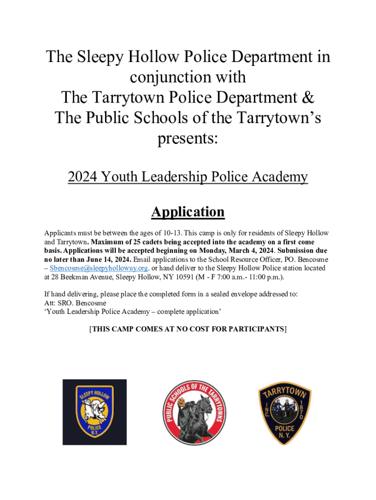 The Sleepy Hollow Police Department in conjunction with The Tarrytown Police Department & The Public Schools of the Tarrytowns presents: 2024 Youth Leadership Police Academy Application Applicants must be between the ages of 1013. This camp is only for residents of Sleepy Hollow and Tarrytown. Maximum of 25 cadets being accepted into the academy on a first come basis. Applications will be accepted beginning on Monday, March 4, 2024. Submission due no later than June 14, 2024. Email...