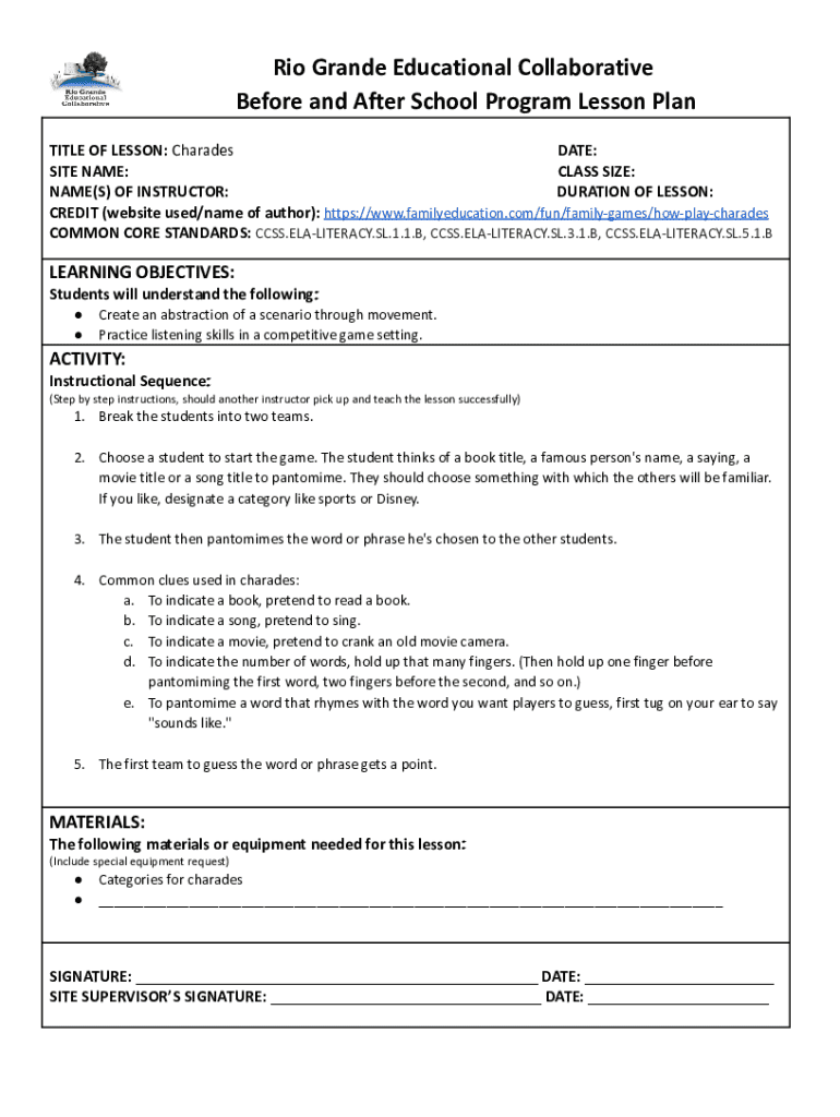Rio Grande Educational Collaborative Before and After School Program Lesson Plan TITLE OF LESSON: Charades DATE: SITE NAME: CLASS SIZE: NAME(S) OF INSTRUCTOR: DURATION OF LESSON: CREDIT (website used/name of author): https://www.familyeducation.com/fun/familygames/howplaycharades COMMON CORE STANDARDS: CCSS.ELALITERACY.SL.1.1.B, CCSS.ELALITERACY.SL.3.1.B, CCSS.ELALITERACY.SL.5.1.BLEARNING OBJECTIVES: Students will understand the following: Create an abstraction of a scenario through movement