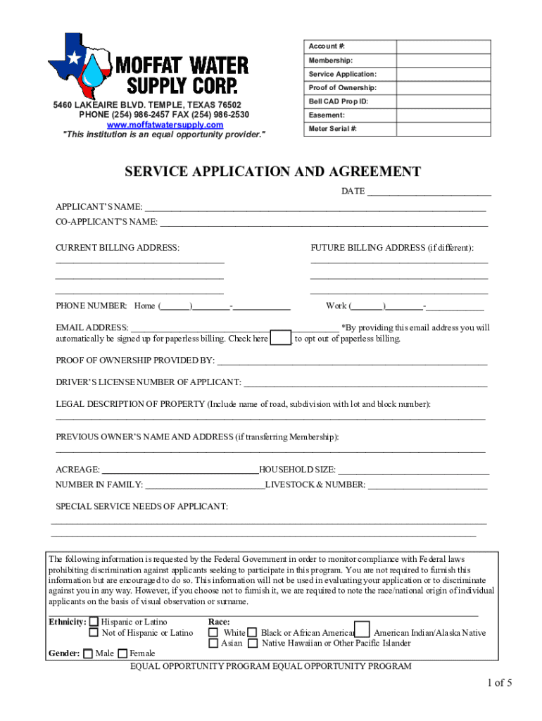 Account #: Membership: Service Application: Proof of Ownership:5460 LAKEAIRE BLVD. TEMPLE, TEXAS 76502 PHONE (254) 9862457 FAX (254) 9862530 www.moffatwatersupply.com \"This institution is an equal opportunity provider.\"Bell CAD Prop ID: Easement: Meter Serial #:SERVICE APPLICATION AND AGREEMENT DATE ___ APPLICANTS NAME: ___ COAPPLICANTS NAME: ___ CURRENT BILLING ADDRESS: ___FUTURE BILLING ADDRESS (if different): _______________PHONE NUMBER: Home ()Work ()___EMAIL
