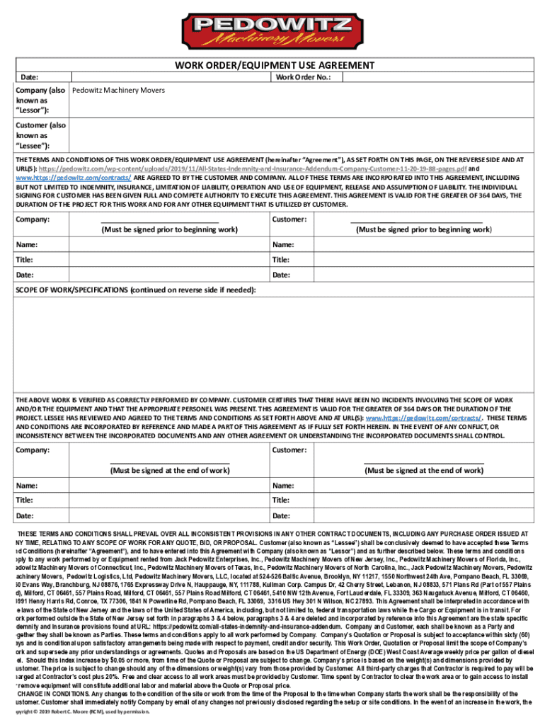 Get the free WORK ORDER/EQUIPMENT USE AGREEMENT