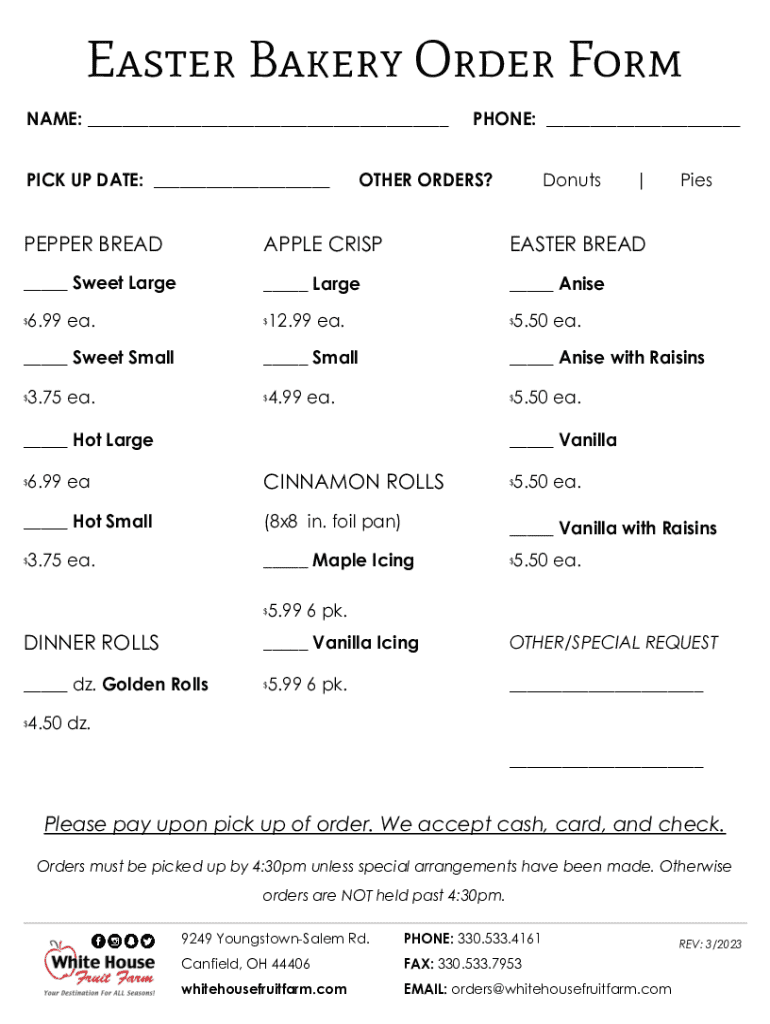 Easter Bakery Order Form NAME: ___ PICK UP DATE: ___PHONE: ___OTHER ORDERS? Donuts|PEPPER READABLE CRISPEST BREAD___ Sweet Large___ Large___ Anise$6.99 ea.$___ Sweet Small $12.99 ea.$___ Small3.75