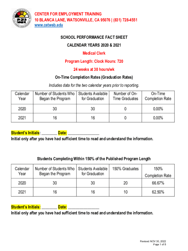 CENTER FOR EMPLOYMENT TRAINING 10 BLANCA LANE, WATSONVILLE, CA 95076 | (831) 7284551 www.cetweb.edu SCHOOL PERFORMANCE FACT SHEET CALENDAR YEARS 2020 & 2021 Medical Clerk Program Length: Clock Hours: